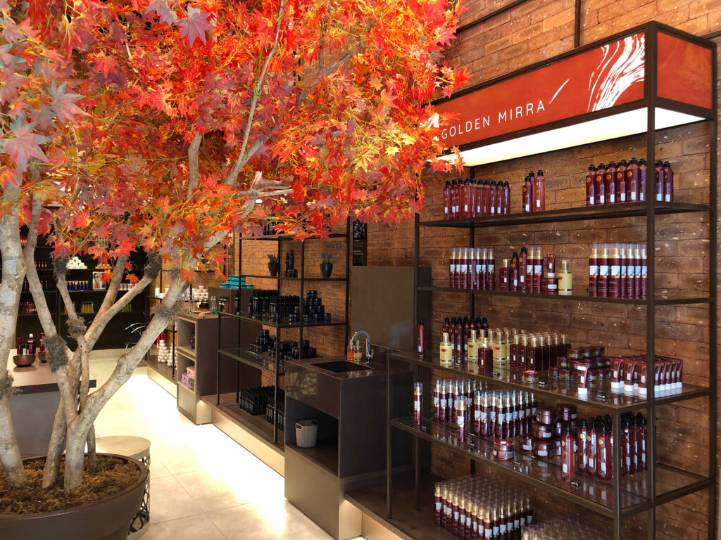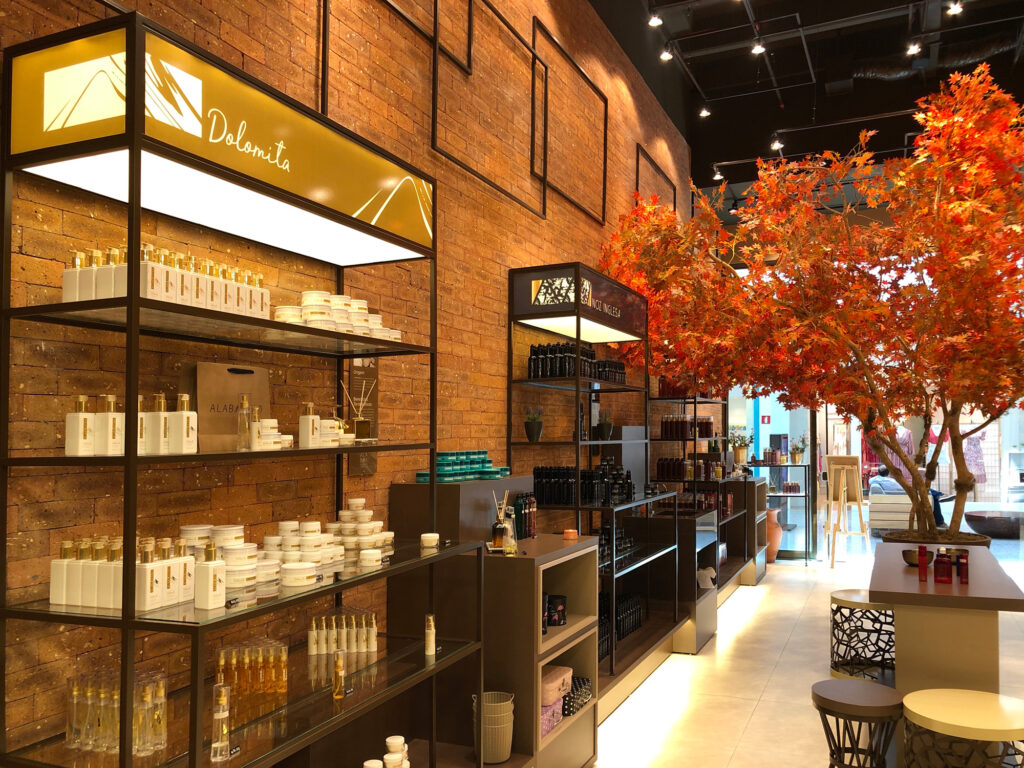 Tijolos aparentes, tons terrosos e mobiliários exclusivos fortalecem a identidade da marca, enquanto cada expositor apresenta os benefícios das linhas Noz Inglesa, Golden Mirra, Lama Vulcânica, Dolomita, Chá Australiano e Cálamo.