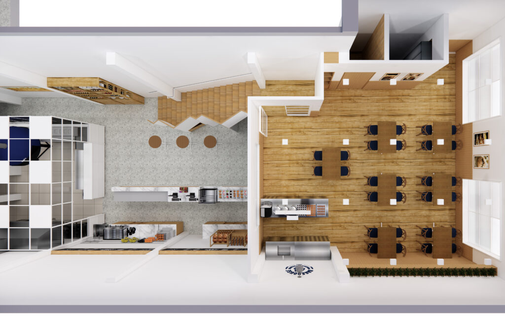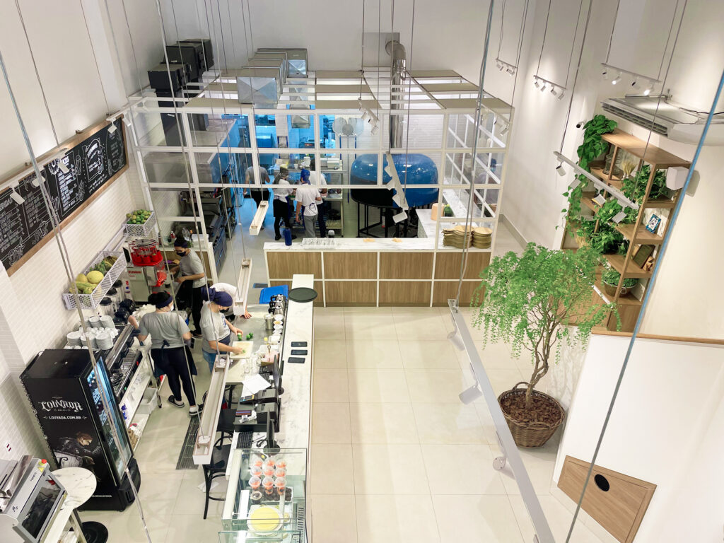 O projeto une minimalismo industrial e elementos biofílicos em uma composição marcada pelo contraste entre branco, azul-marinho e tons de madeira. A escada em zigue-zague se torna protagonista no pé-direito duplo, enquanto o forno personalizado com ladrilhos azuis reforça a identidade visual. A produção é integrada ao salão, permitindo que o cliente acompanhe o preparo sem barreiras.