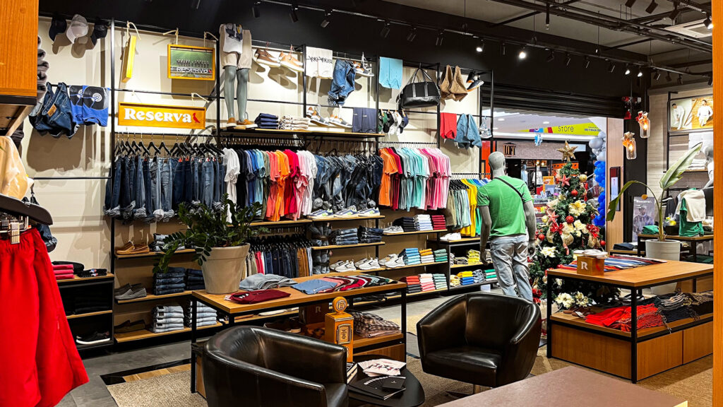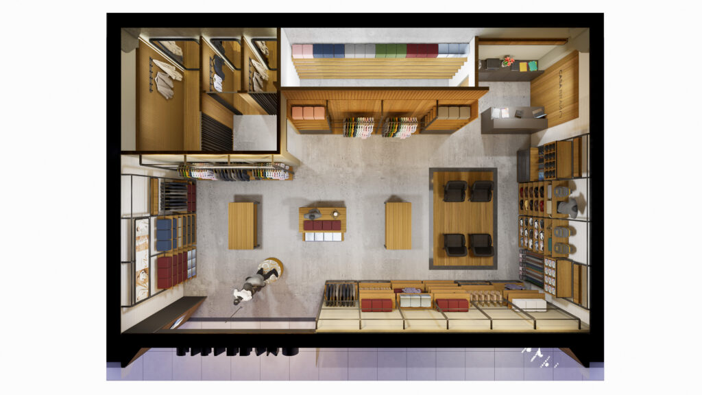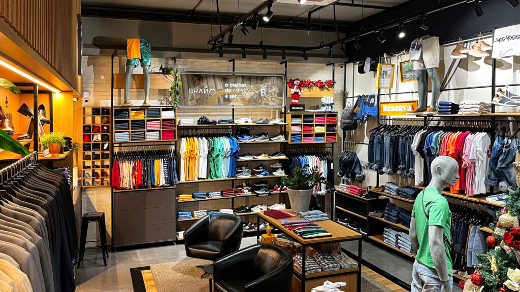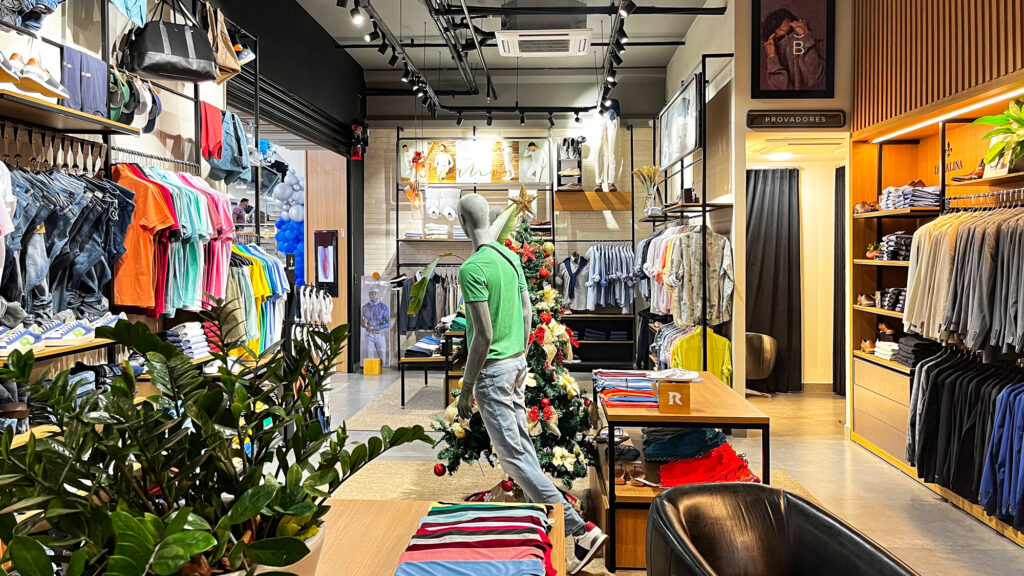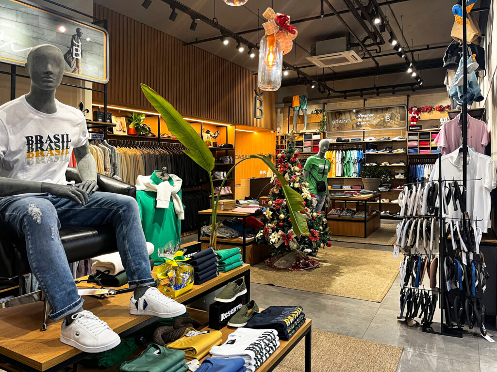 Provadores amplos e reservados garantem conforto e privacidade, e poltronas posicionadas no centro da loja reforçam a atmosfera acolhedora. A iluminação em LED com spots direcionáveis valoriza os produtos e destaca os elementos arquitetônicos, criando uma experiência de compra exclusiva e sofisticada.