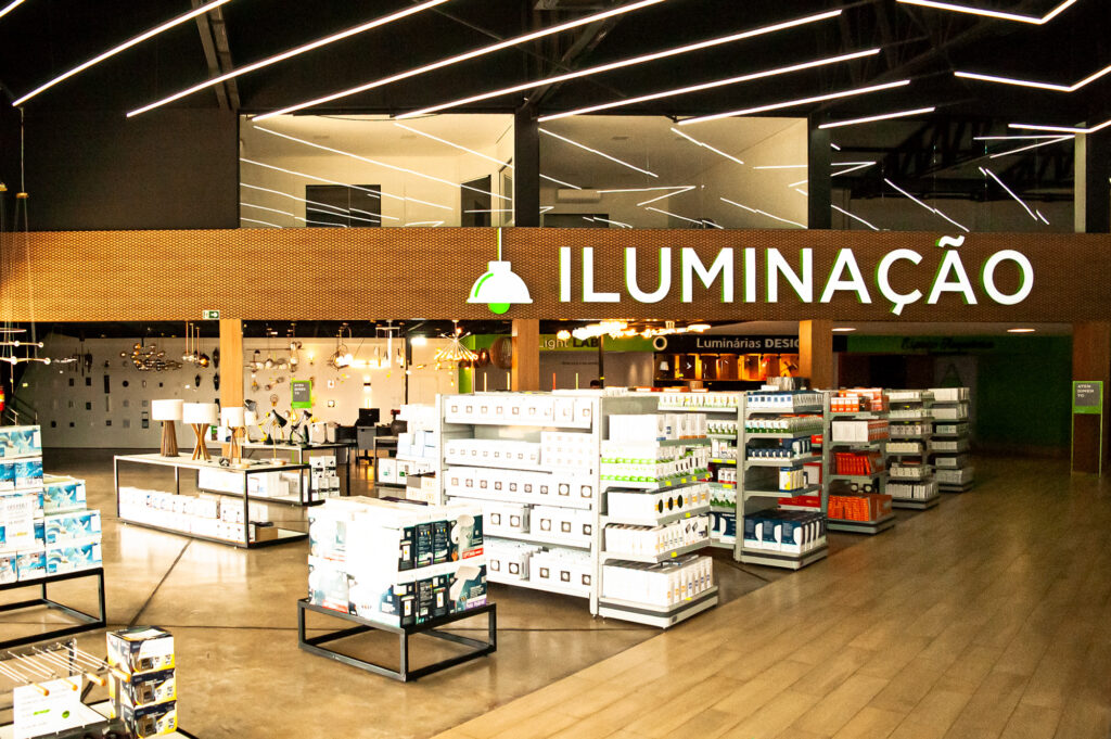 O layout foi pensado para atender dois públicos principais: eletricistas e arquitetos. A loja se organiza em dois grandes setores. De um lado, a área de componentes elétricos prioriza o autosserviço, com gôndolas que facilitam a visualização e a agilidade na compra. Do outro, o setor de iluminação e energia solar valoriza produtos de design e cria um ambiente mais consultivo, com espaço dedicado ao atendimento de arquitetos.
