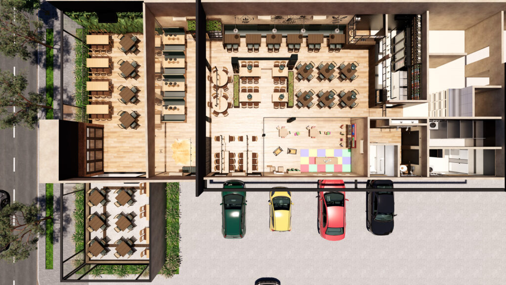 O Parrilla do Campo, em Sinop (MT), foi concebido para traduzir na arquitetura o conceito gastronômico farm to table, criando uma experiência que conecta o cliente ao ambiente rural de forma contemporânea. O projeto mistura elementos industriais com uma estética rústica e acolhedora, inspirada nas antigas fazendas e mercados do interior. A fachada em aço corten e estruturas aparentes remete a um mercadão tradicional, enquanto o interior surpreende com decoração biofílica, objetos de fazenda e iluminação direcionada que valoriza cada detalhe do espaço. Com 214 lugares, o restaurante foi pensado para receber desde encontros a dois e reuniões de negócios até momentos em família, contando também com um espaço kids integrado ao conceito visual. A presença de vegetação natural, iluminação natural e uso de energia solar reforçam a atmosfera acolhedora e sustentável do ambiente.