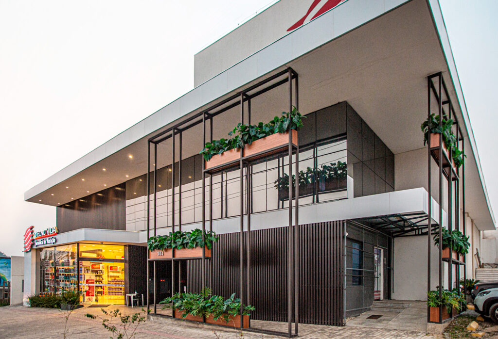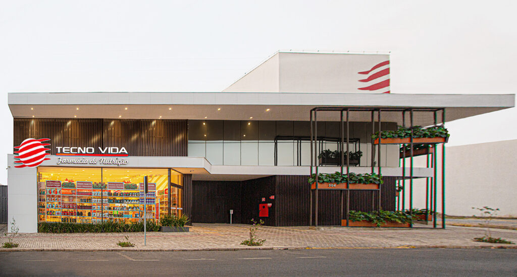 A Tecno Vida é uma farmácia especializada em suplementação com um conceito inovador, voltado para dietas restritivas e atendimento personalizado. O projeto arquitetônico foi desenvolvido para traduzir esse diferencial, unindo grandiosidade, organização e acolhimento em um ambiente contemporâneo. A fachada imponente, com elementos biofílicos e linhas marcantes, antecipa a experiência interna: um espaço clean, com predominância do branco e destaque para o vermelho da marca.