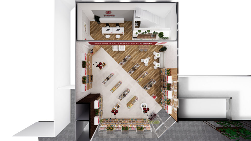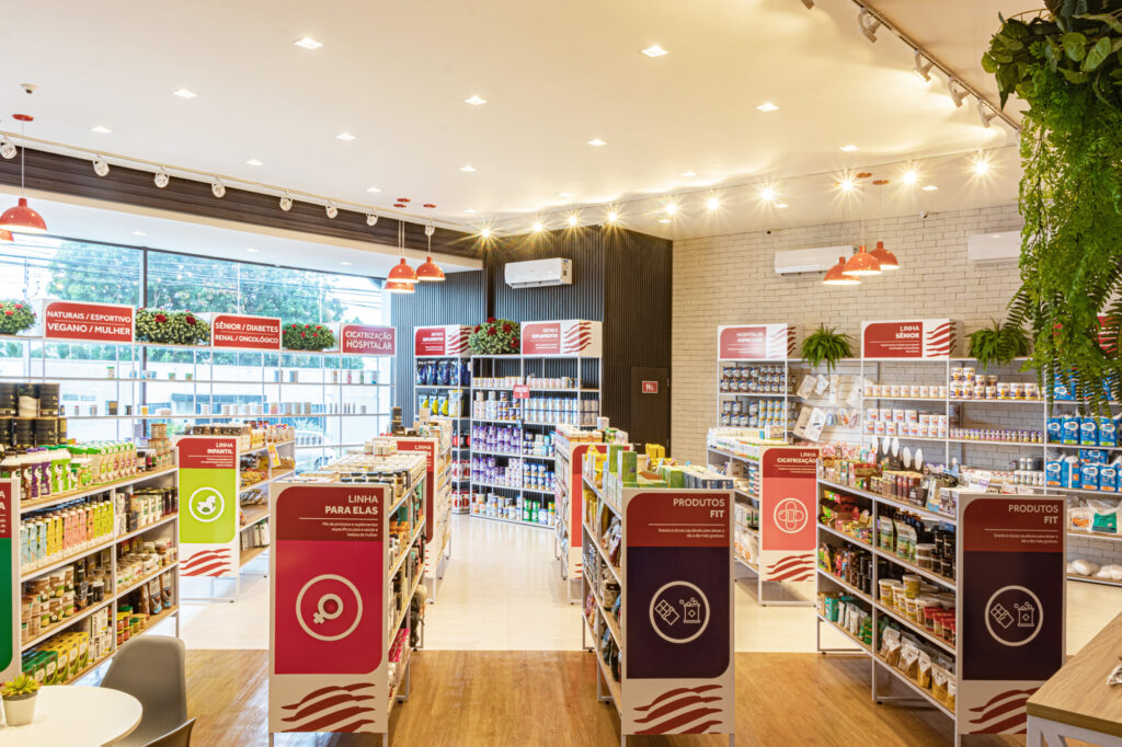 O layout foi planejado para atender dois perfis de clientes: o autosserviço, com expositores organizados por categorias de dieta, e o atendimento especializado para suplementação manipulada. Materiais com inspiração industrial e iluminação em LED quente direcionada aos produtos valorizam a exposição e reforçam a sensação de conforto.